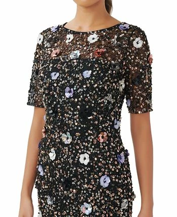 Neutral hues bloom in the sparkling sequins, shiny beads and dimensional dazzle embellishing this chic elbow-sleeve sheath from Adrianna Papell.