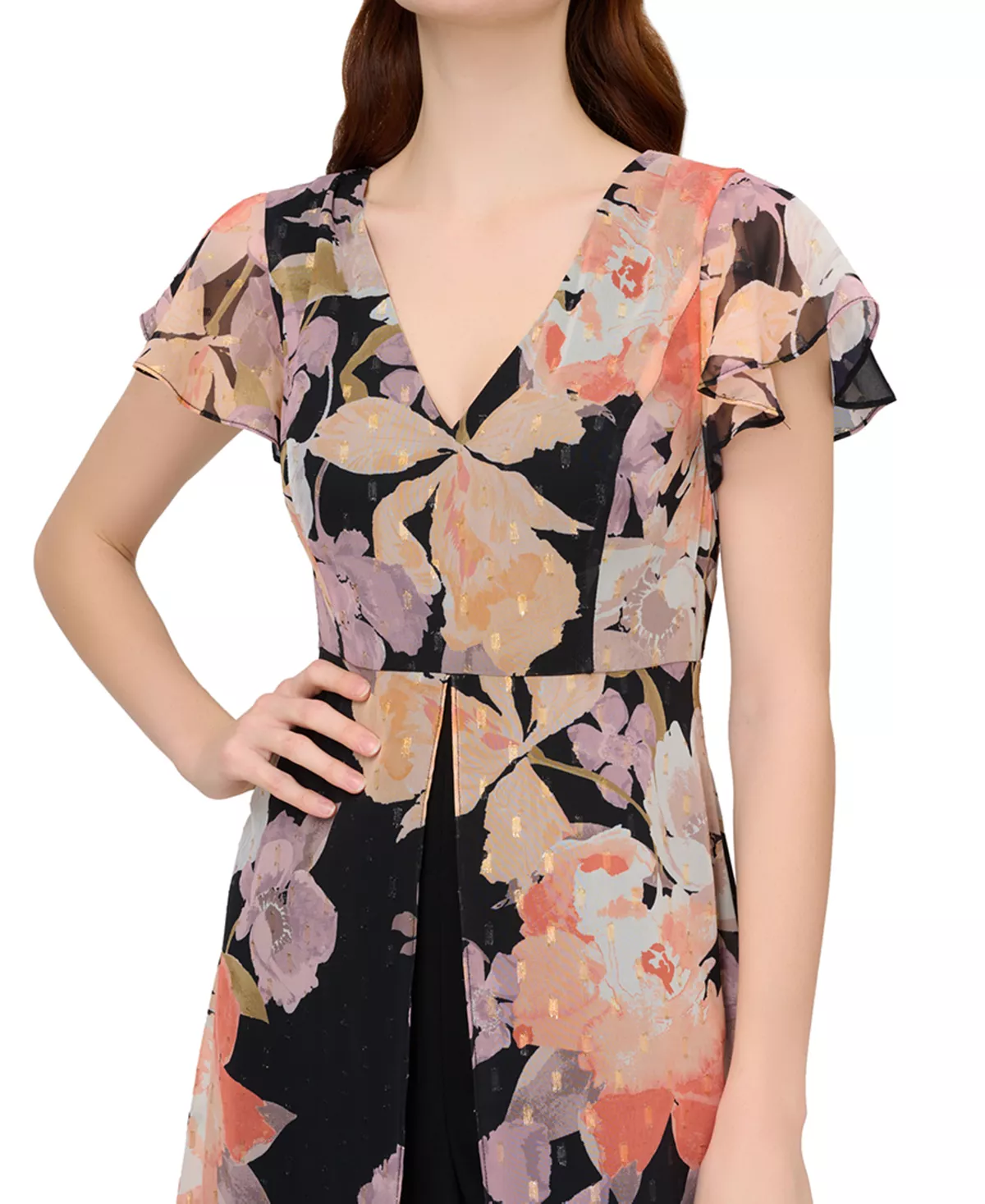 Brighten up your special event wardrobe with Adrianna Papell’s floral-print jumpsuit, featuring an overlay design.
