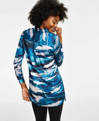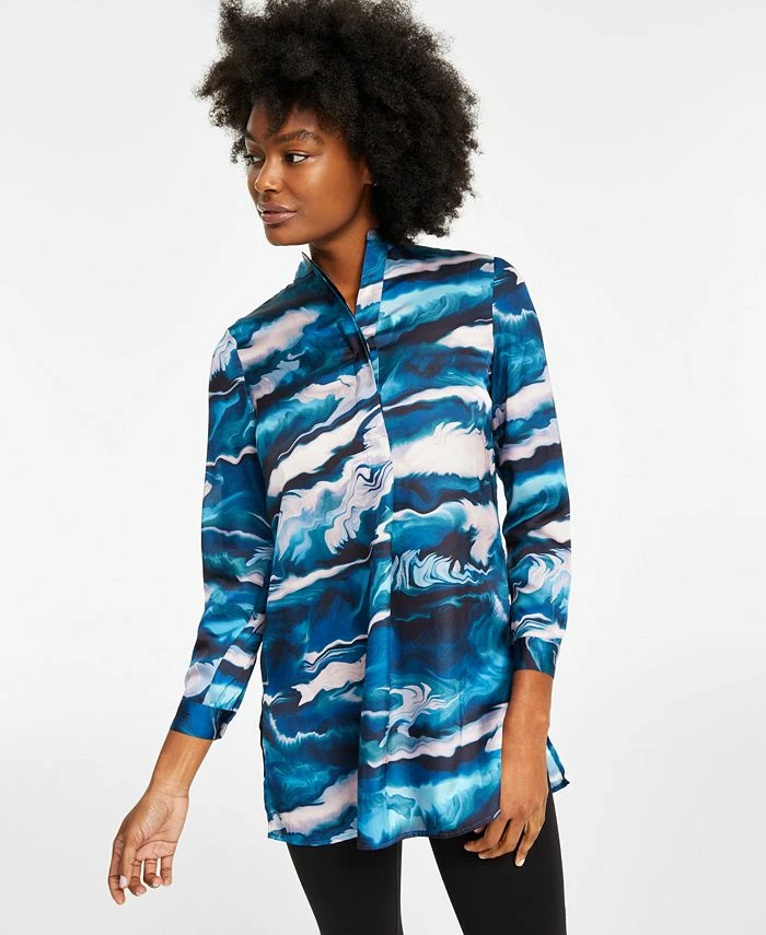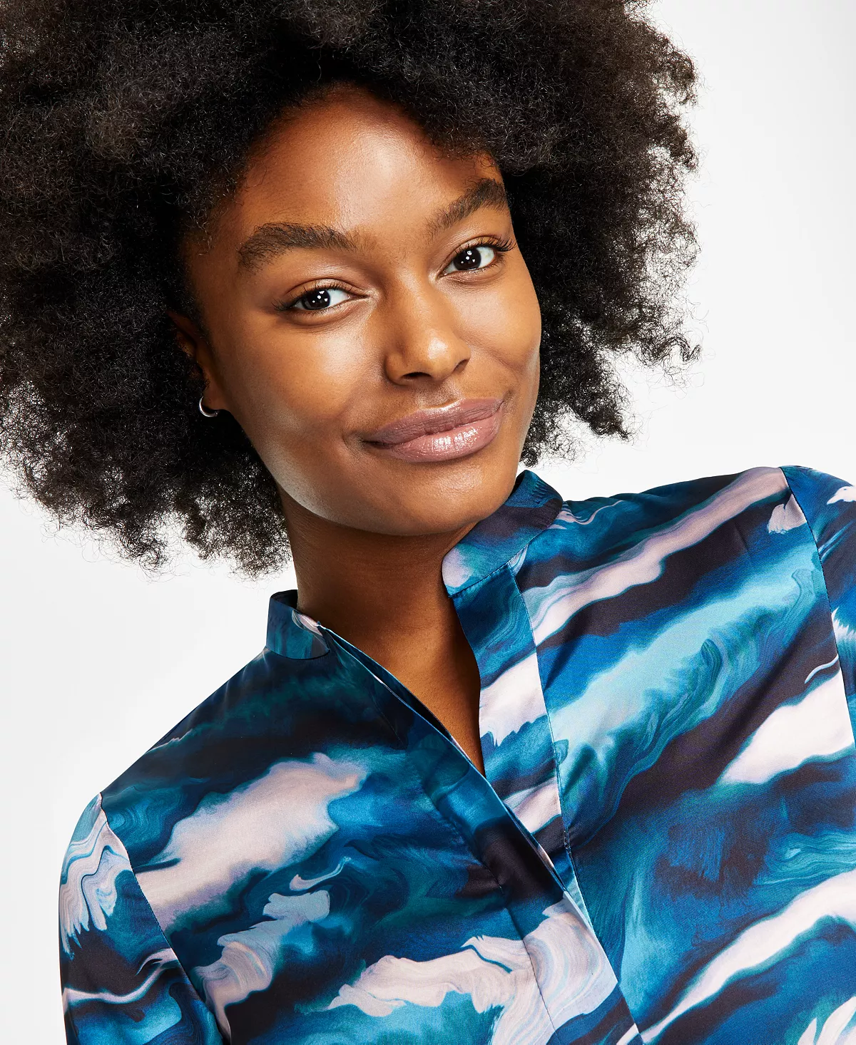 Dreamy marble-print satin enhances this popover tunic shirt from Anne Klein. A band collar and slits at the sides refine the look.
