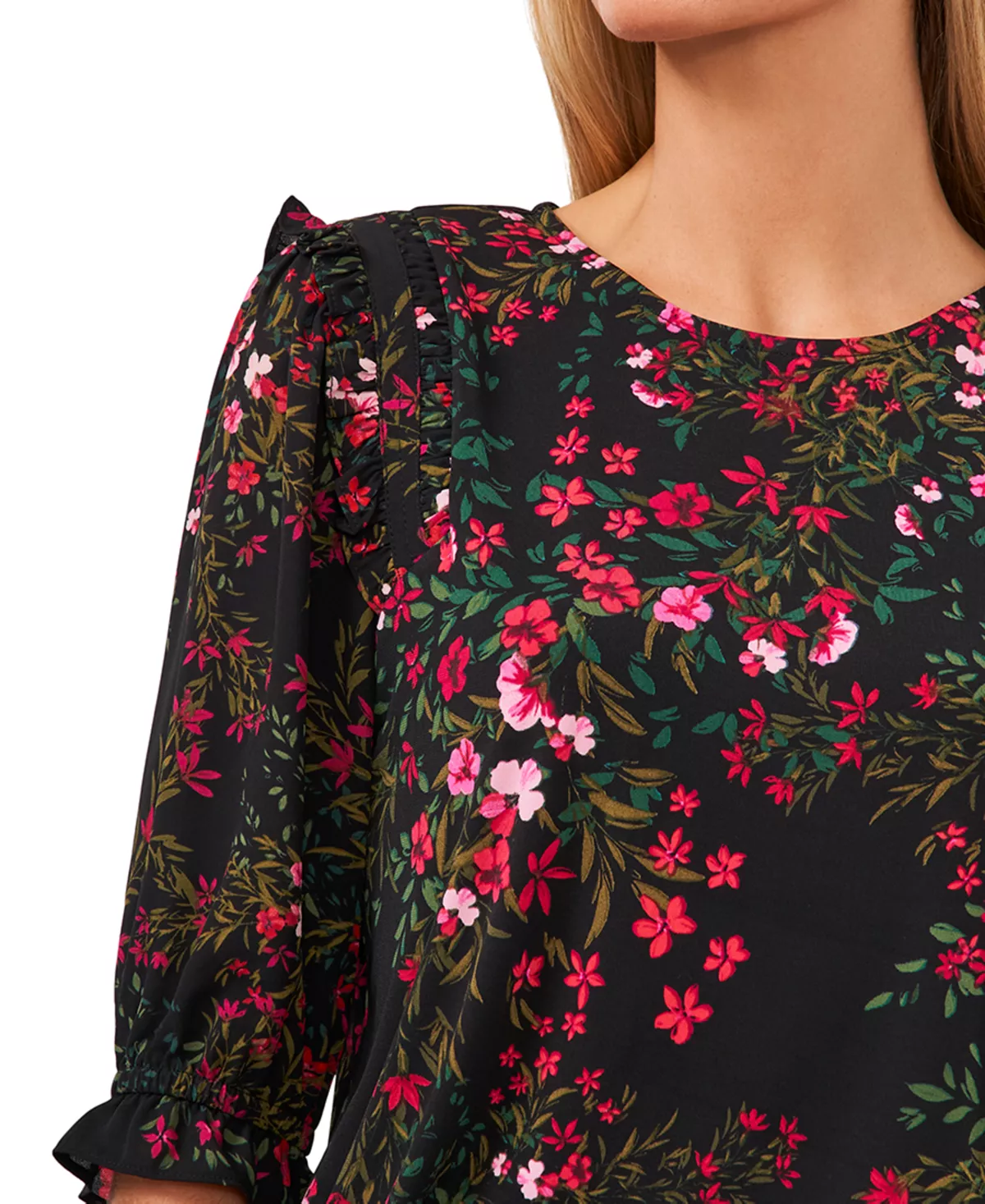 Fresh in florals and ravishing in ruffles, this 3/4-sleeve top by CeCe is an always-chic wardrobe pick.