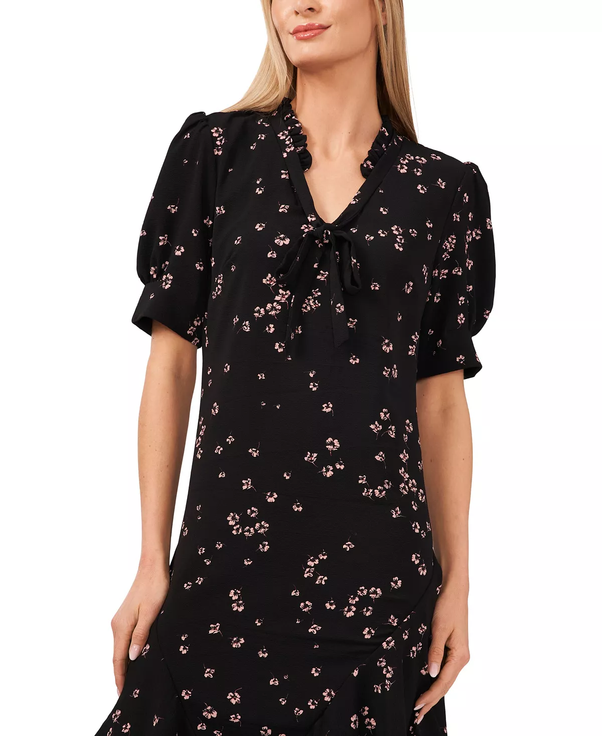 CeCe brings delicate detail to your dress options thanks to the ruffled trim, puffed sleeves, and tie neck detail on this dress.