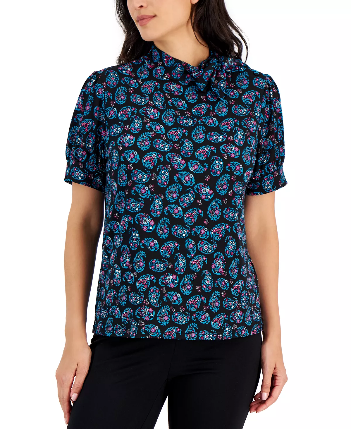 An asymmetrical bow accents a mock neck, polished this vibrant knit top from Charter Company.