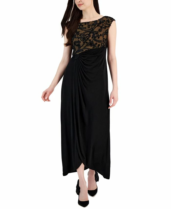 - Draped detail on skirt; embroidered detail on mesh bodice