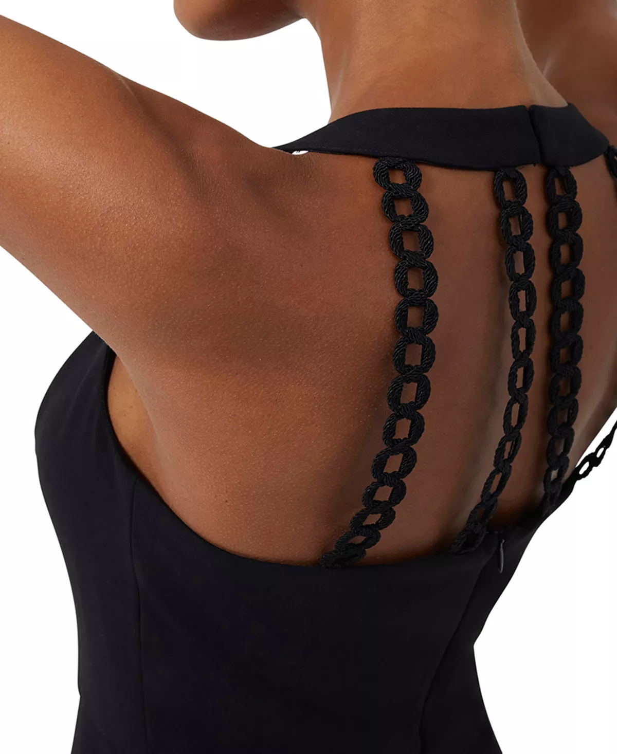 - Hook-and-eye at back neck; back zipper closure