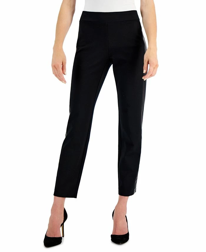JM Collection updates a pair of slim-fitting ponté-knit pants with faux leather stripes down the sides for a sleek look.