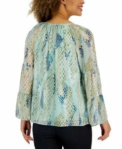 A border print adds a contemporary touch to vibrant florals, bringing a fresh look to this woven top from JM Collection. Lattice at the neckline stylishly frames your face.