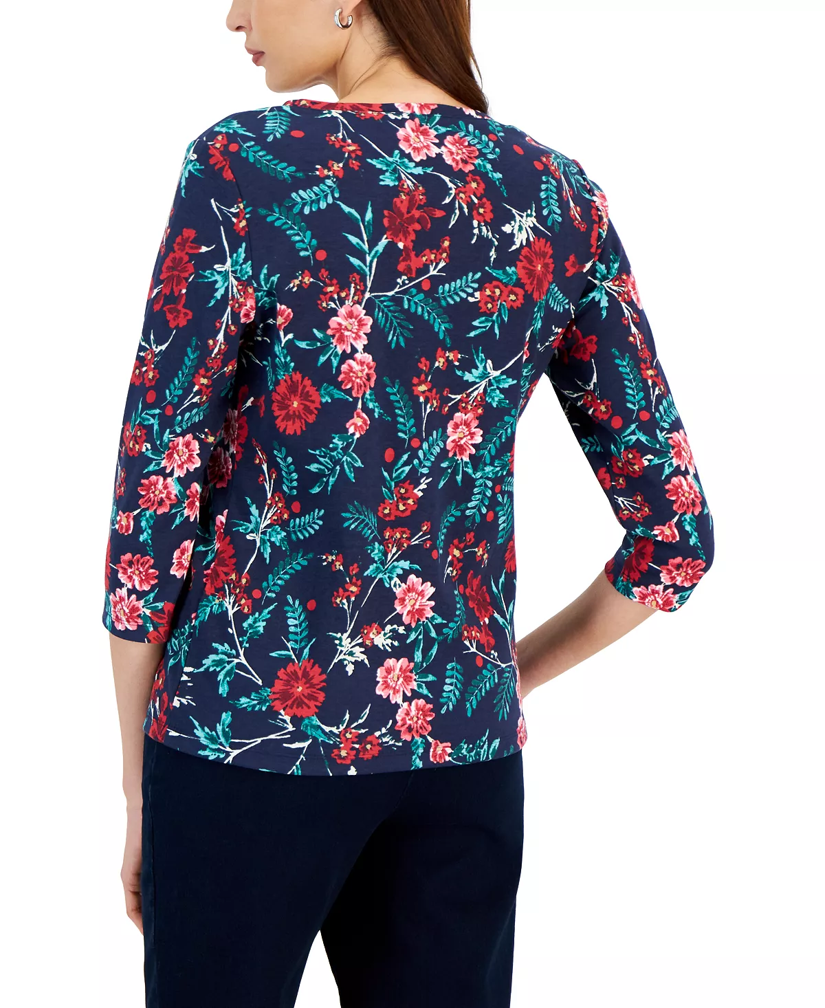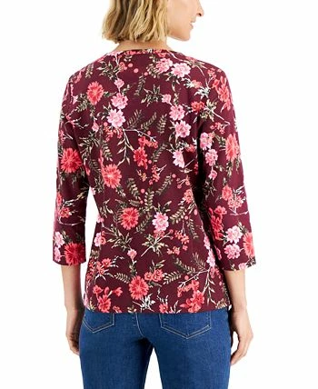 Earthy tones highlight a tonal print, bringing fresh fun to Karen Scott’s relaxed knit Henley top.