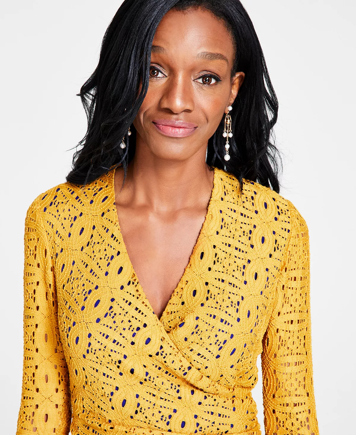 - Surplice V-neck; Bodycon silhouette