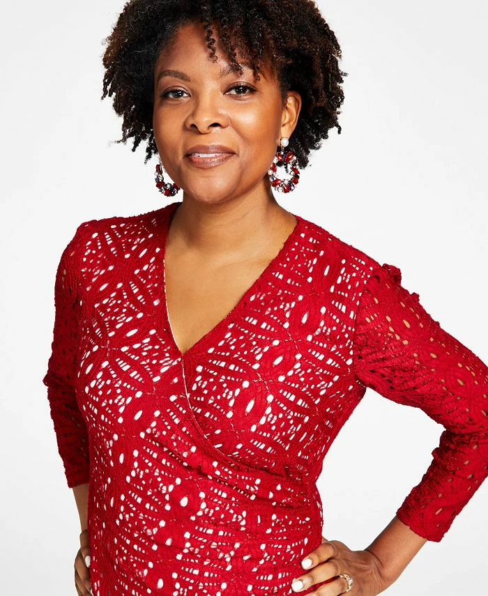 A contrasting color dramatically highlights the swirling lace designs of Kasper’s shapely surplice V-neck maxi dress. The cascading side ruffle finishes the lovely look with a flowy flourish.