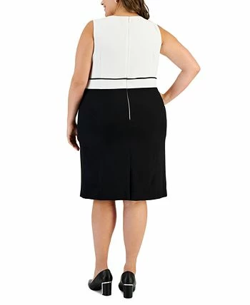 Be boardroom-bold in this statement dress by Kasper. The colorblock design creates a confident look, whilst the classic sheath silhouette offers a tailored and professional finish, this plus size dress receives its final polish from a sleek two-tone waistband.