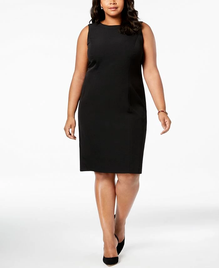 Kasper’s streamlined plus size sheath dress offers a sophisticated work-week look with a classic sleeveless silhouette, while a knee length adds coverage.