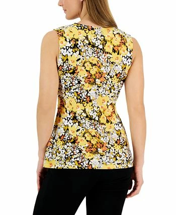 A bold floral print and chic wrap style brighten this work-ready sleeveless top from Kasper.