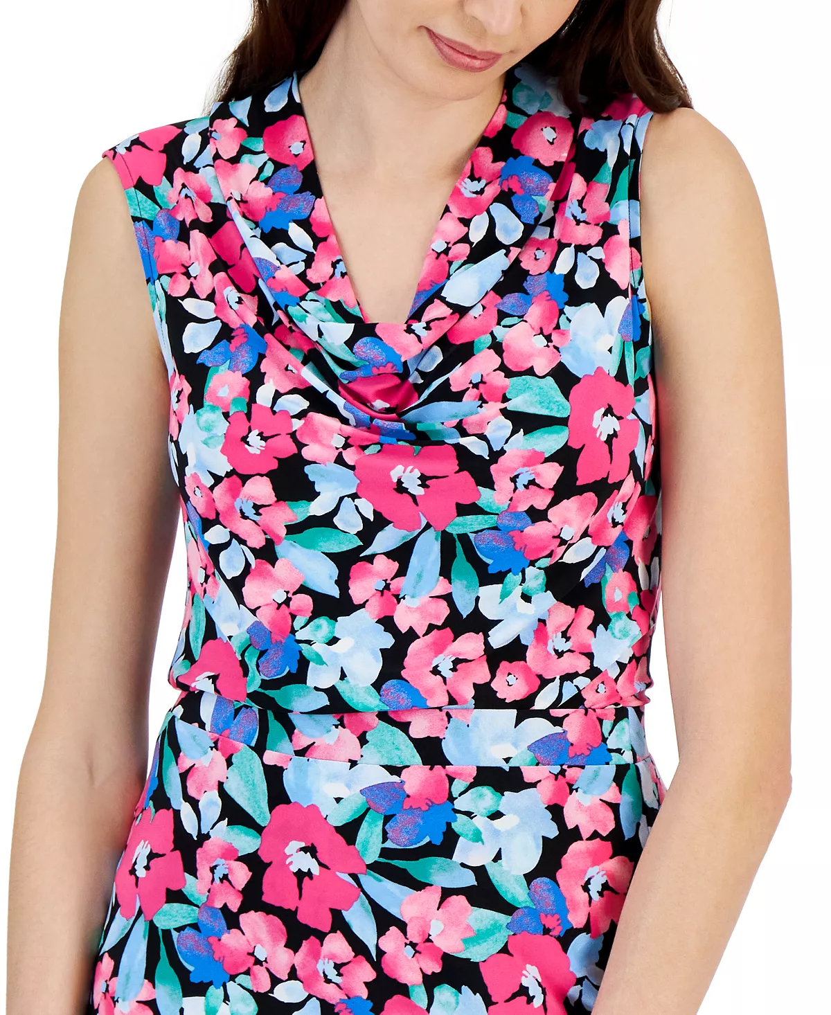 Make your work look bright and chic: Kasper’s sleeveless blouse is finished with a flattering cowlneck and a colorful floral print.