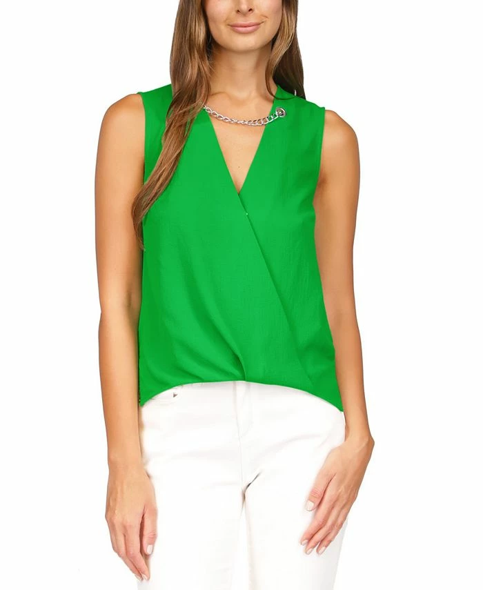 A stunning fusion of classic and contemporary, this MICHAEL Michael Kors faux-wrap top features a chain at the neckline and vents at the hem.