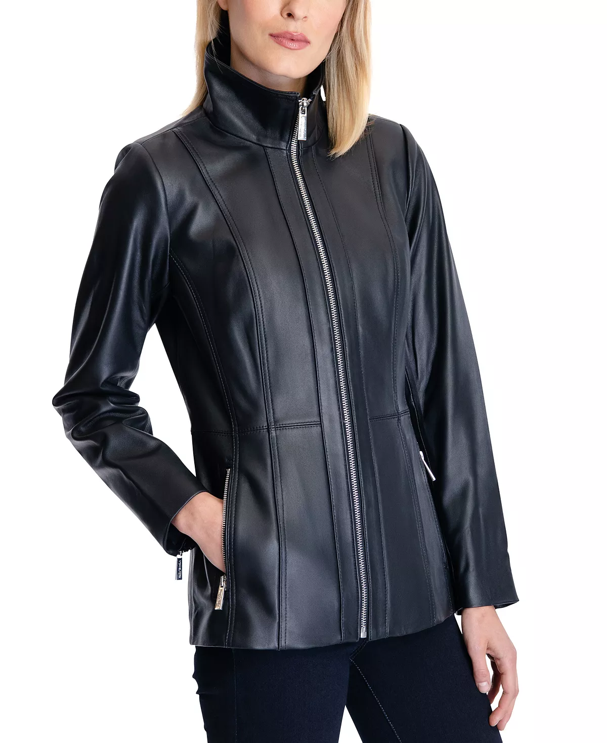 A sleek funnel collar tops off this stunning leather coat from MICHAEL Michael Kors, designed with two zip pockets and a full zip front.