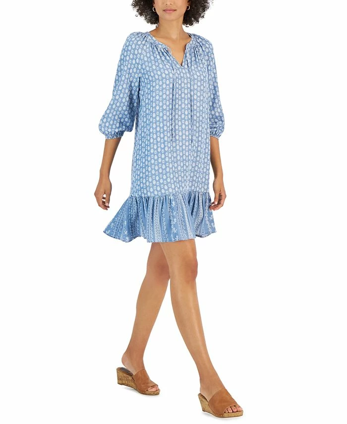 Ease into comfortable fashion in this Style & Co printed dress. Designed with an open, split neckline and a ruffle at the hem, this is a peasant dress sure to impress.