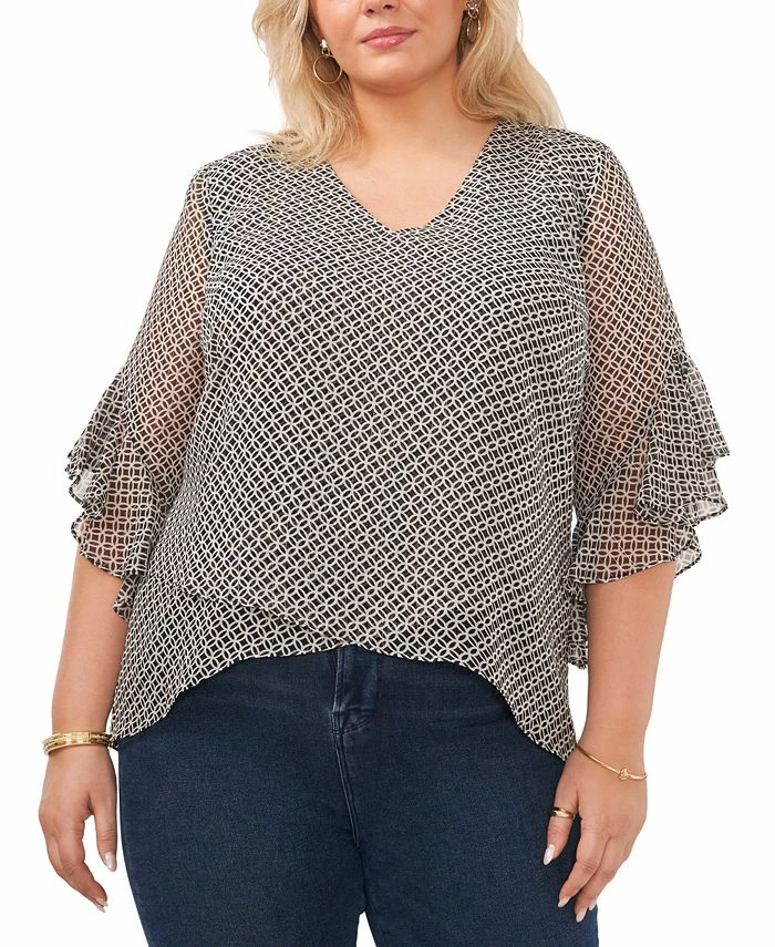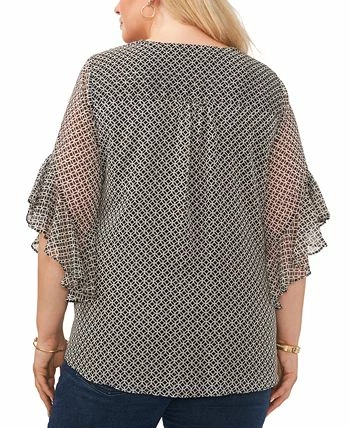 Pull your look together with this printed plus size top from Vince Camuto designed with fluttery sleeves. A crossover hem is the perfect finish.