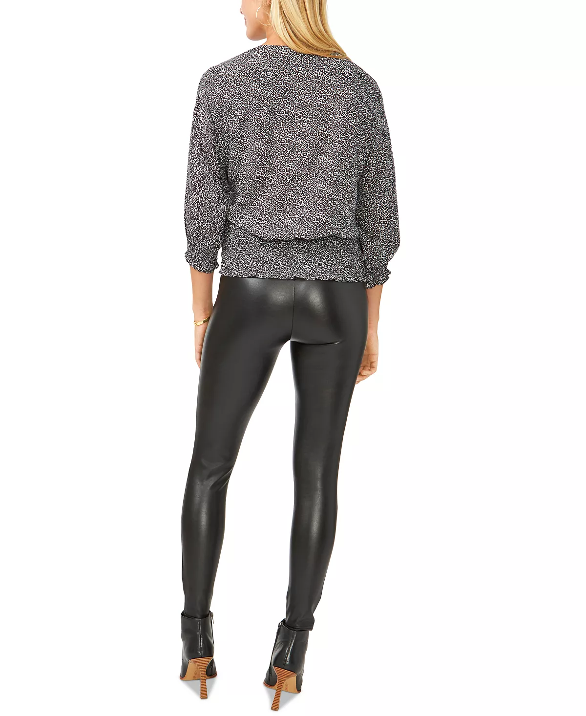 Vince Camuto’s smocked-hem top gets it right with 3/4-length sleeves and smocked details for texture.