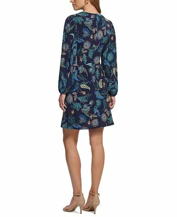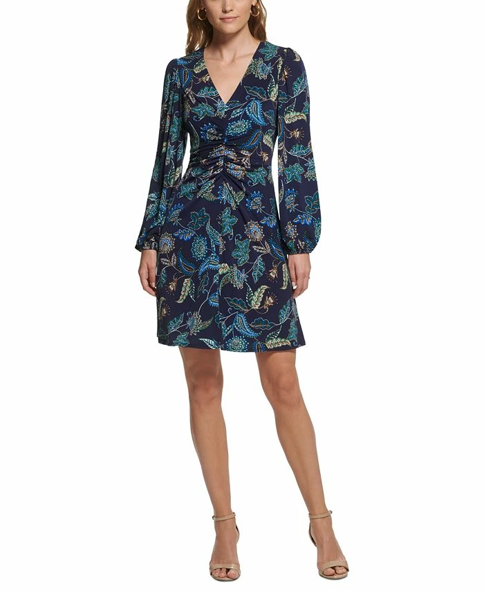 Slightly draped ruched detailing shapes the soft printed knit of this Vince Camuto dress with flowy balloon sleeves.