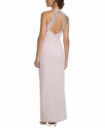 Sophisticated with a touch of glamour, Vince Camuto’s sleek halter gown is accented with scintillating sequins at the neckline and back straps.